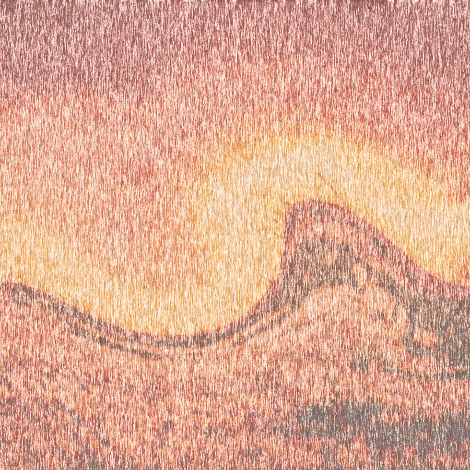 I have changed the straight horizontal feeling of a western railroad track as sunset to incorporate a softer curve. Instead of a horizontal horizon, I have very fine vertical lines that almost feel like an otherworldly rain
