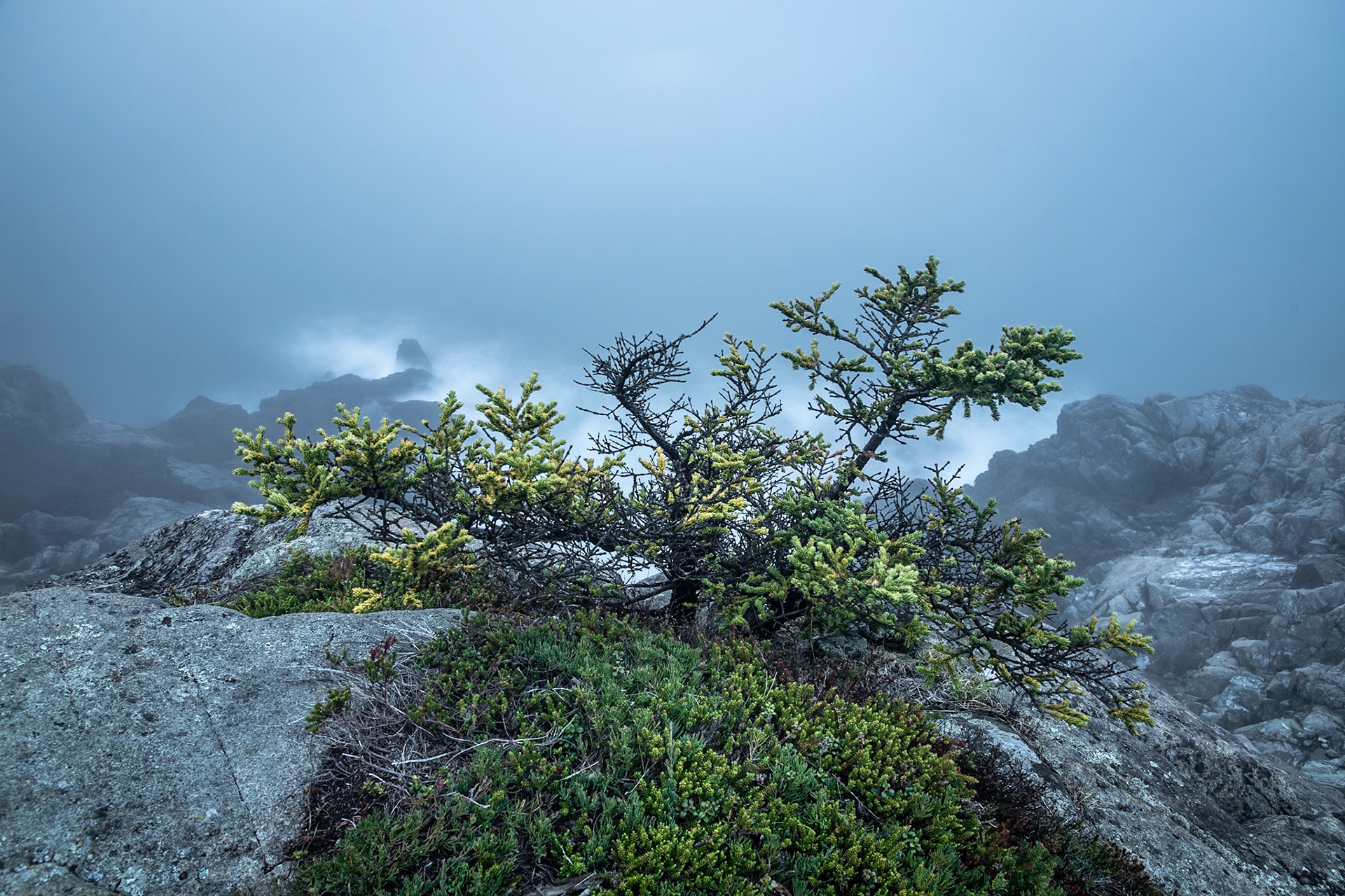 The softness of the background, with just a hint of waves on the rocks, belies the harshness of the environment. The cold blue hues, the ruggedness of the granite and the dying branches suggest the tenaciousness of the stunted spruce.