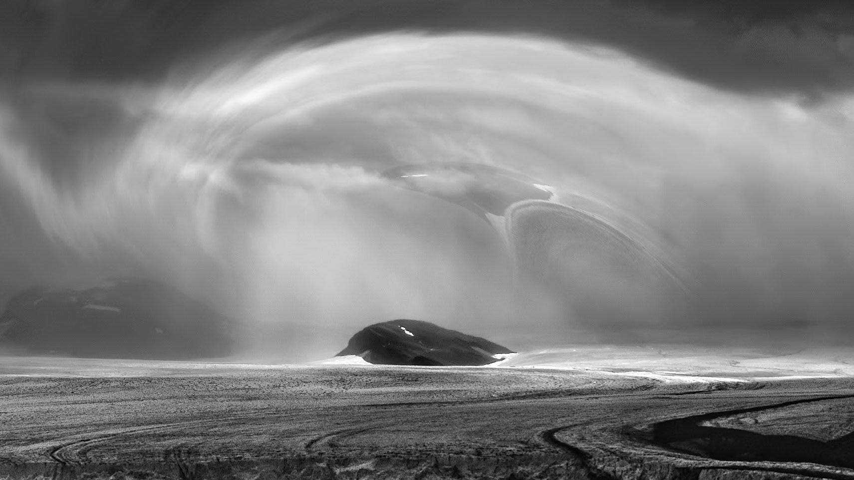 There is not a harsh line in this photo but elegance in the many curves in the glacier, clouds and rock. And yet, there is a mystery in the center of the swirling cloud.