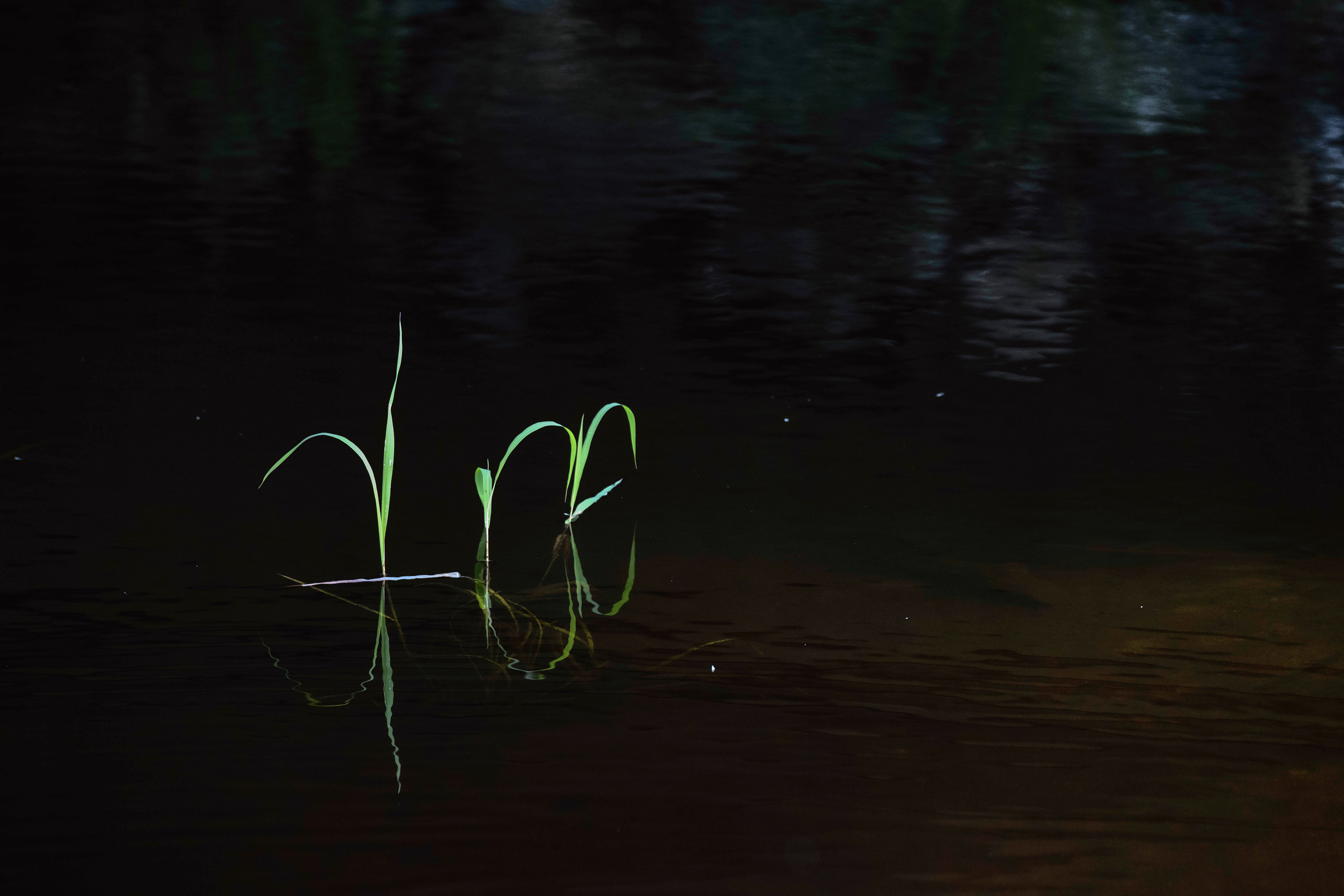 The gentle curves with the mirrored reflection of the curves of these plants are what drew my attention. There is an elegance to these plants, and a calming effect is created by the undersaturated green and yellow of the leaves. The dark background allows the plants to stand, and the small white pieces of plant material and slight ripples in the surface reflection identify this location as a slowly meandering body of water.