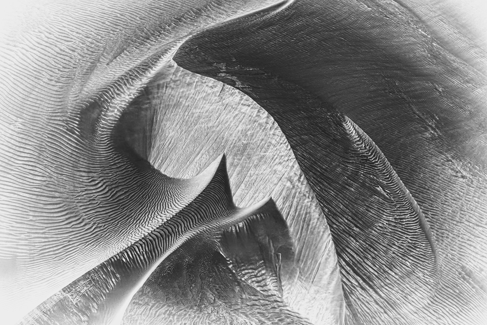 I feel a juxtaposition between the soft curves of the ripples in the sand, the major curve lines in the dunes and the very sharp spikes in the center
